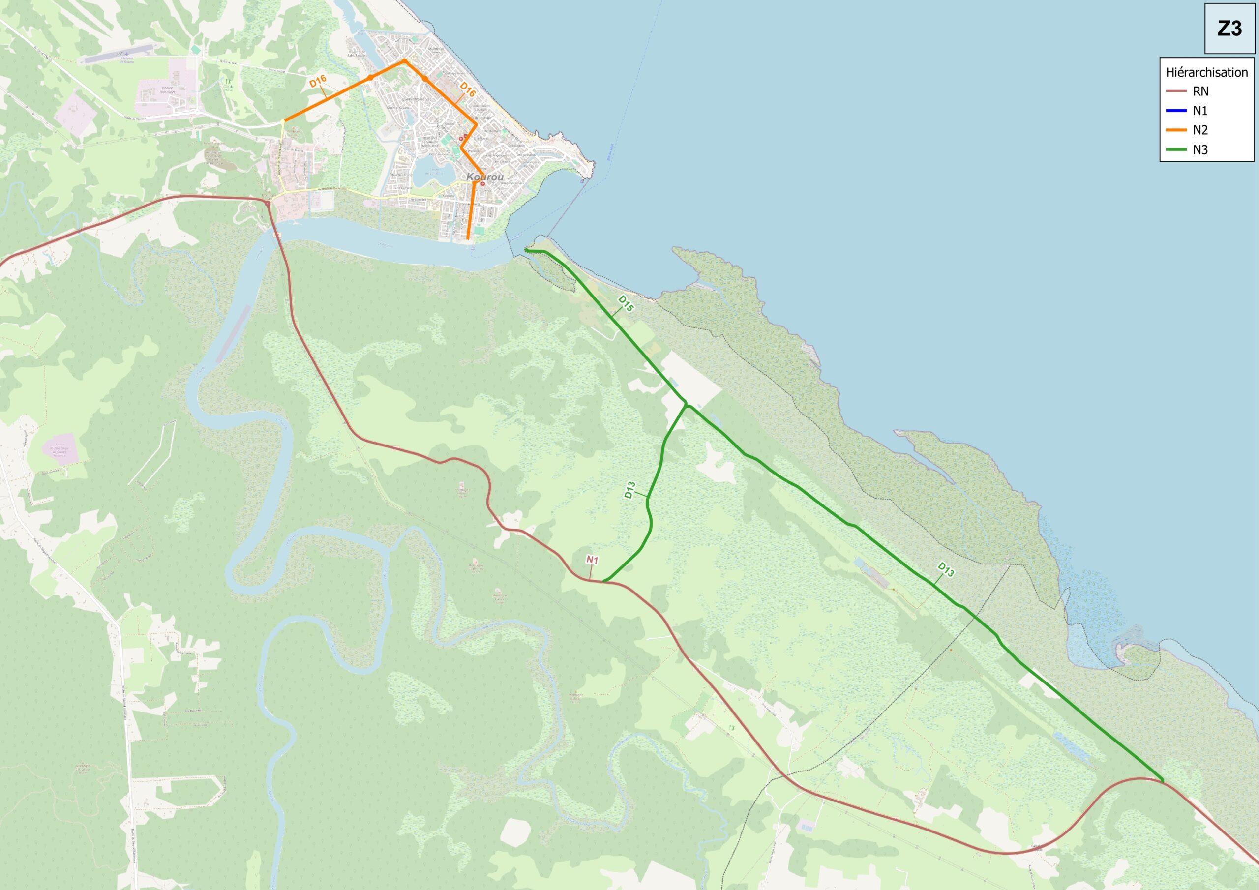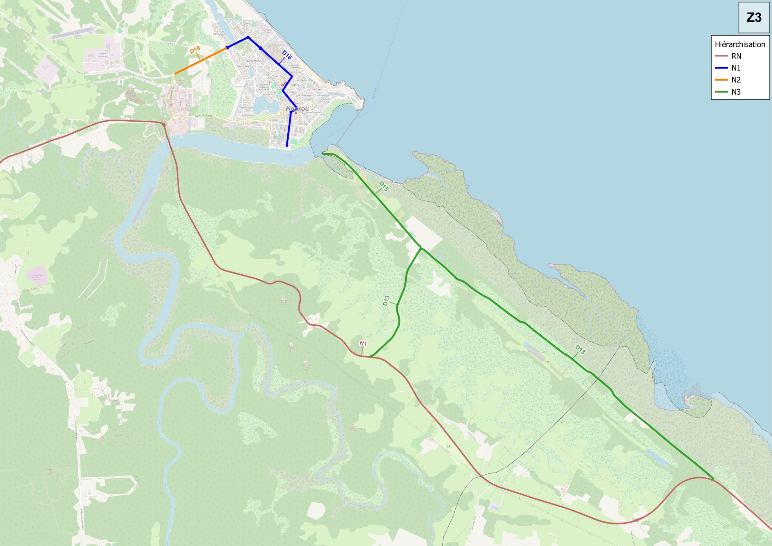 Accotements 2 x 4m + surlargeur en enrobé de 1,50m au droit de chaque carrefour avec voie ouverte à la circulation publique ET revêtue uniquement (les raccordements à la chaussée des accès privés et pistes sont traités jusqu'à 4m maximum) Dans les virages dangereux : proposition de bordure chanfreinées