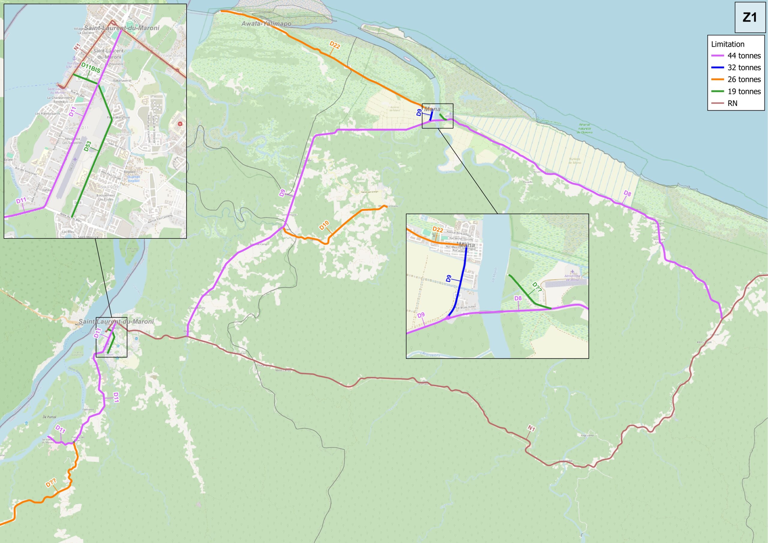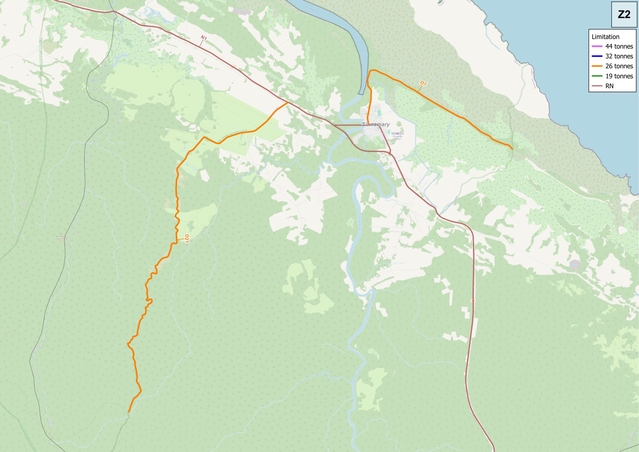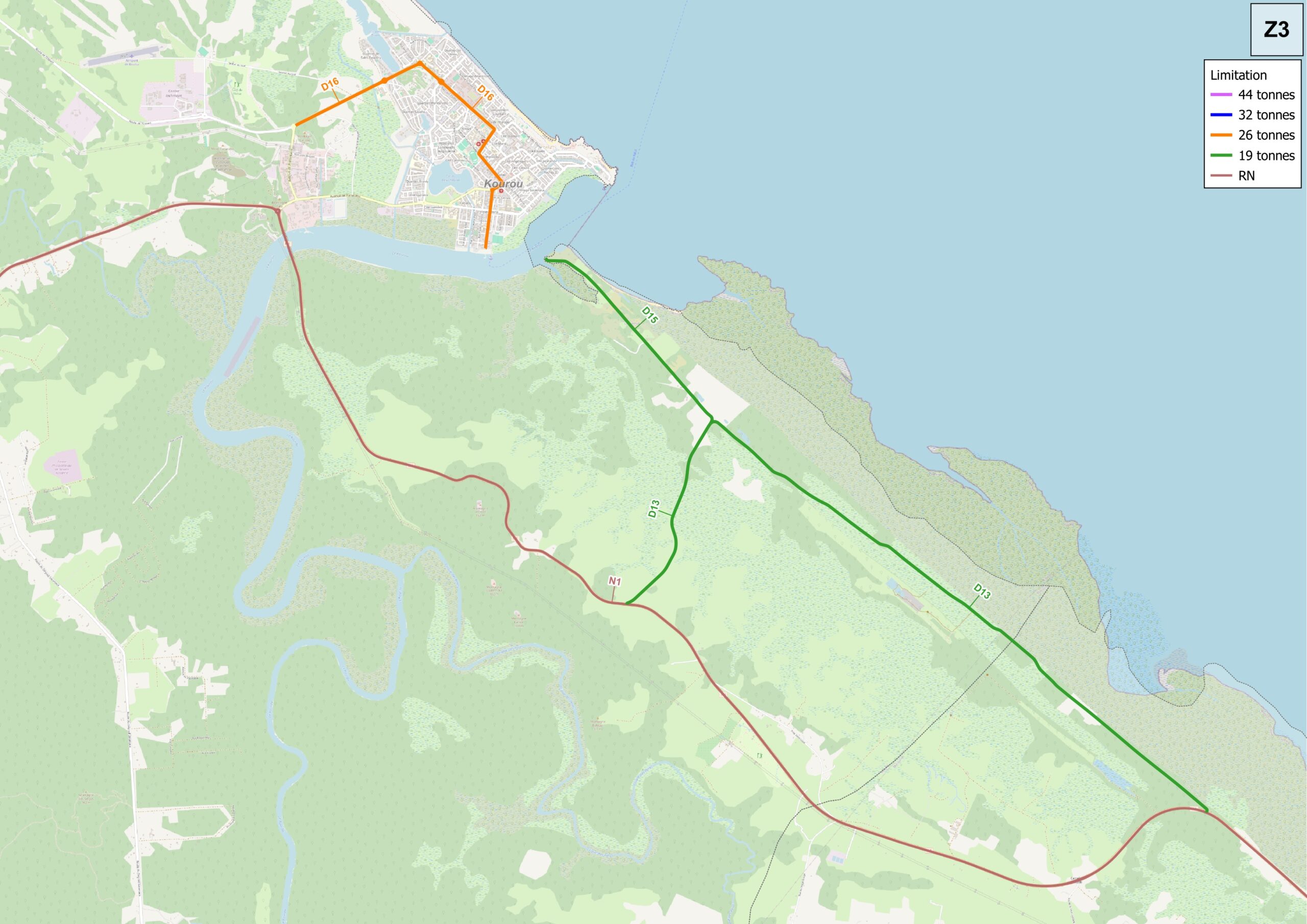 Hauteur : 4,30m - Largeur : variable en fonction du profil en travers de l'aménagement en amont et en aval - Tonnage : 19 tonnes (sauf itinéraire touristique : 26 tonnes)