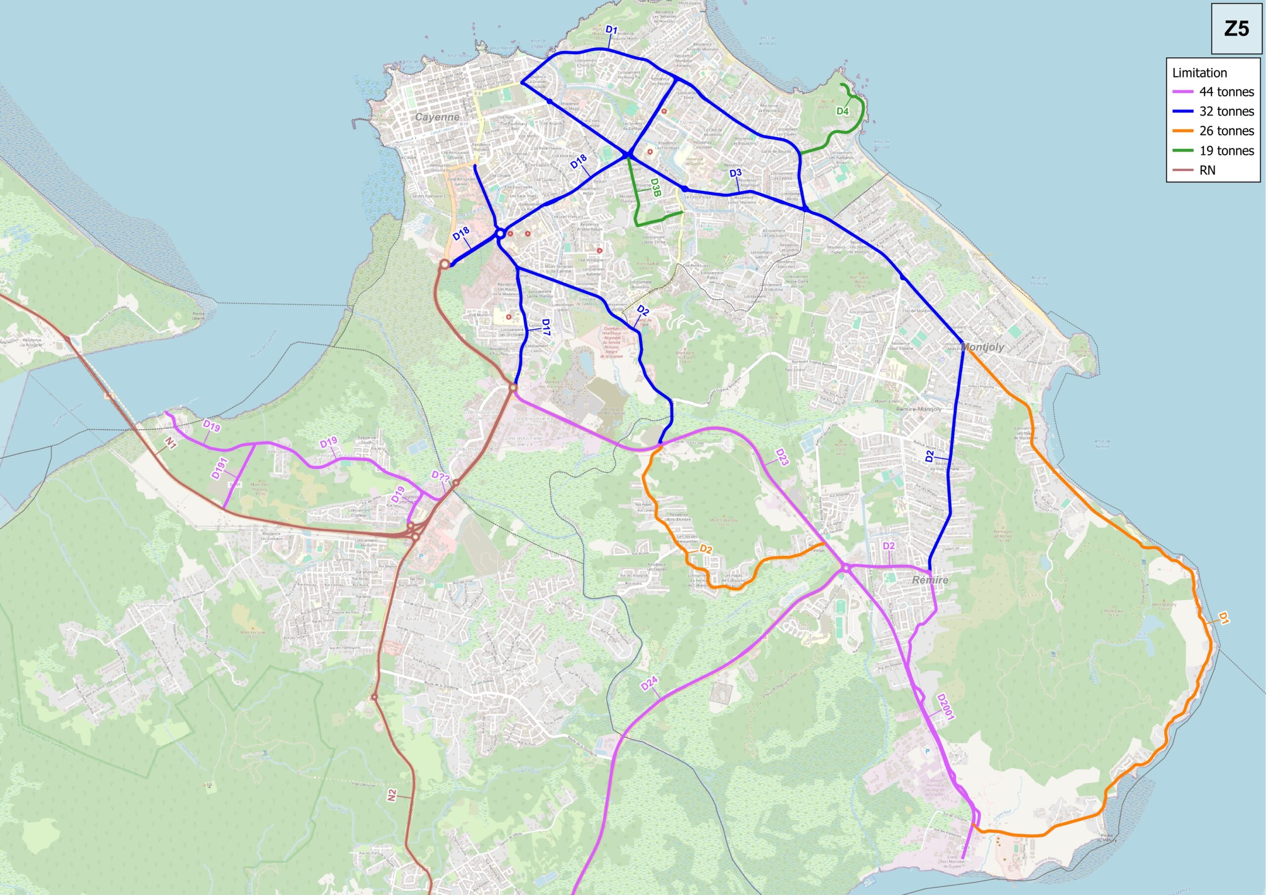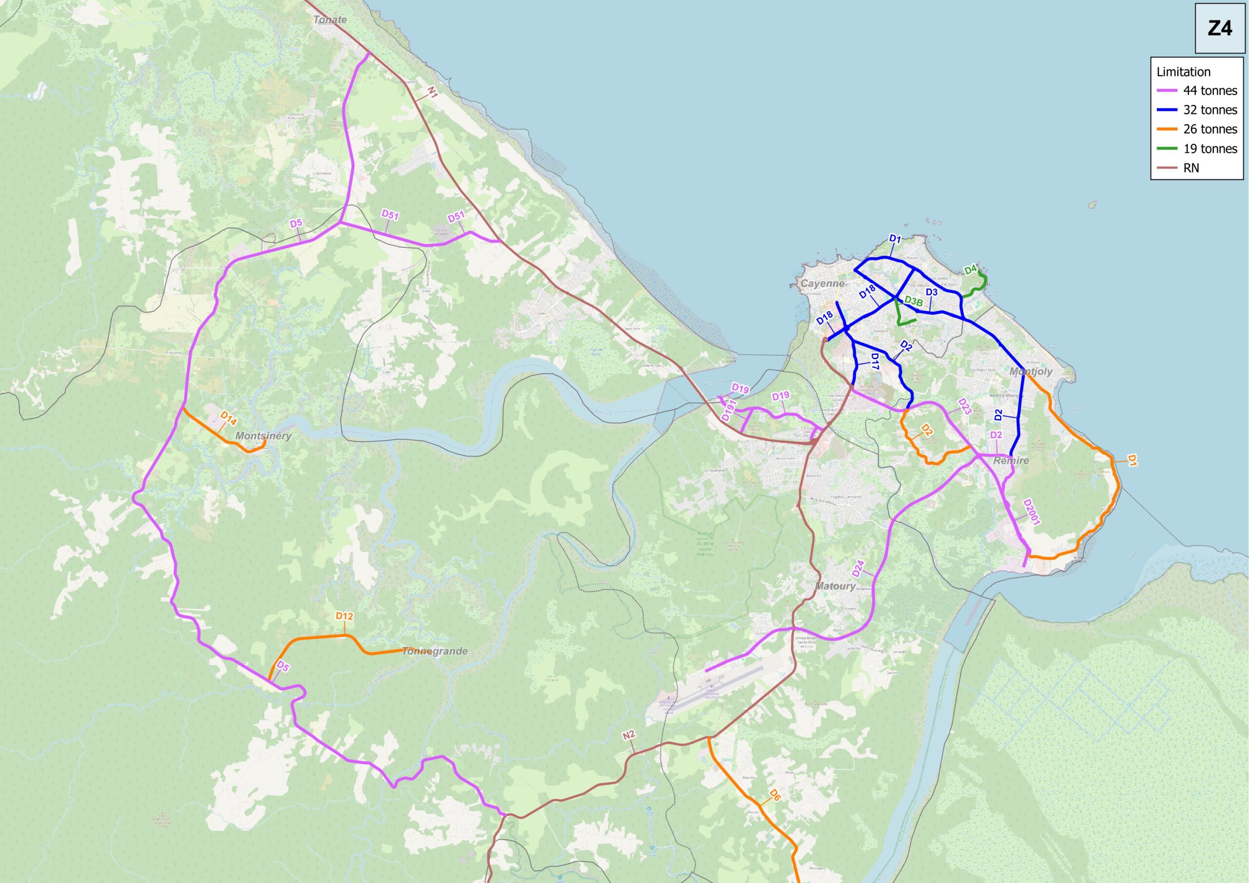 Hauteur 4,30 m, Largeur de 5,50m pour la voie de circulation ; la surlargeur est conditionnée par la nécessité d'assurer une continuité des voies pour modes actifs - Tonnage : 19 tonnes (sauf itinéraire touristique : 26 tonnes)