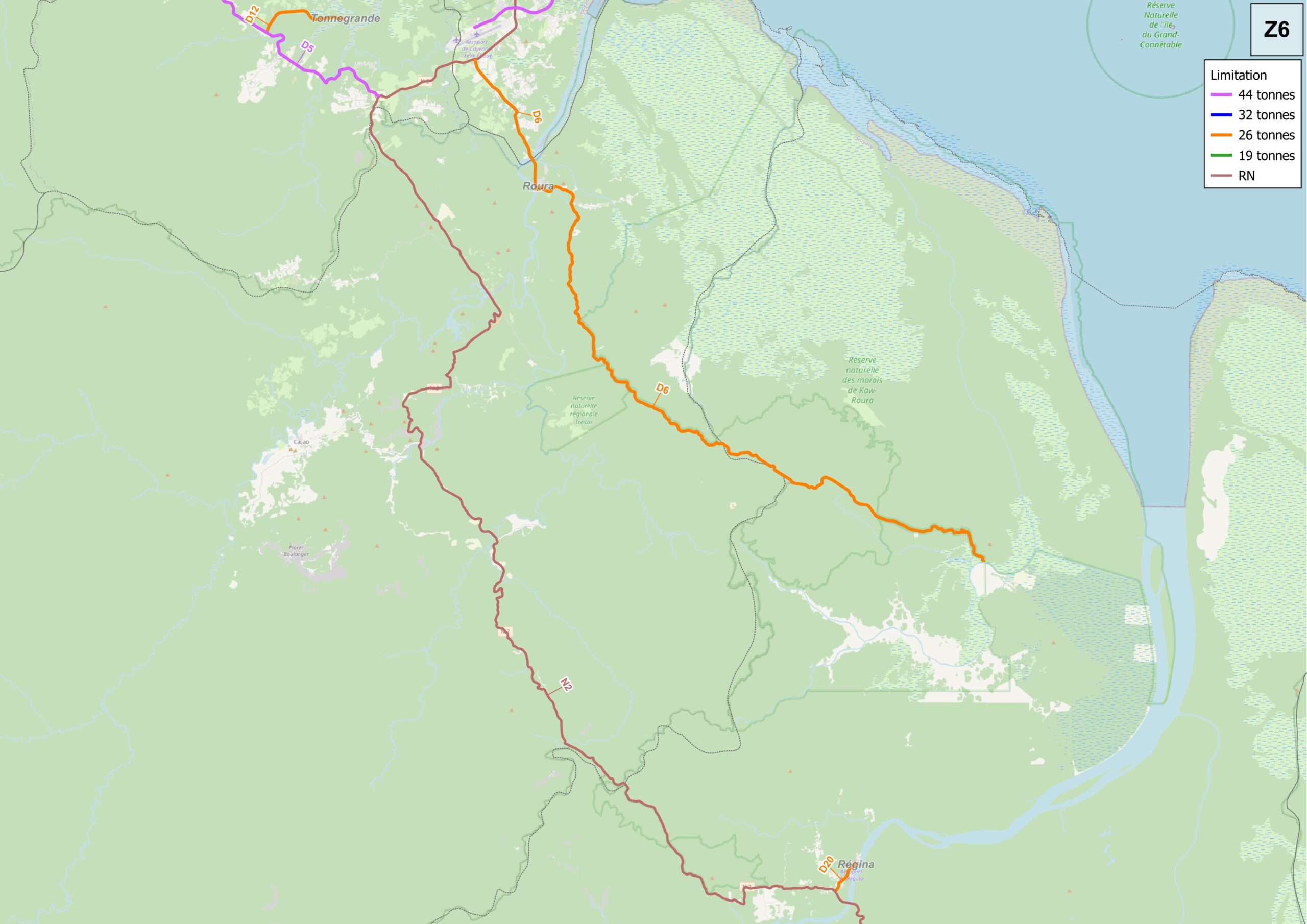 Hauteur 4,30 m, Largeur entre 6,60 m et 7,00 m pour la voie de circulation ; la surlargeur est conditionnée par la nécessité d'assurer une continuité des voies de déplacements alternatifs - Tonnage : 38 tonnes